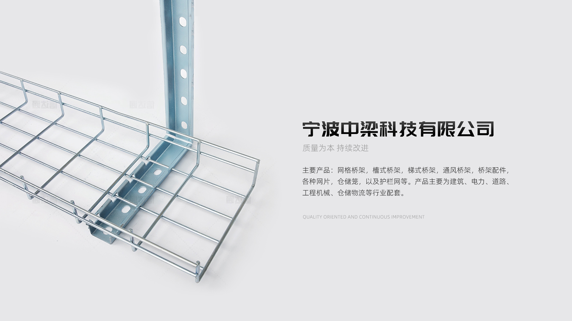 主要產品:網格橋架,槽式橋架,梯式橋架,通風橋架,橋架配件,各種網片,倉儲籠,以及護欄網等。產品主要為建筑、電力、道路、工程機械、倉儲物流等行業配套。